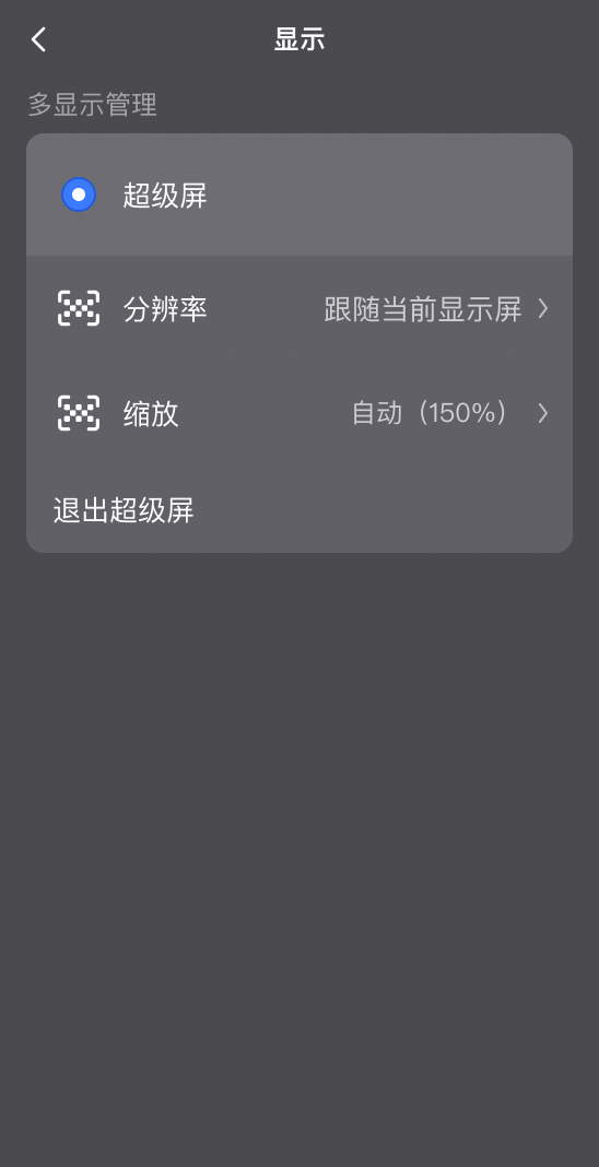 移动端用户,远程连接成功后,进入[操作]-[显示],选择[跟随当前显示屏],即会触发超级屏;