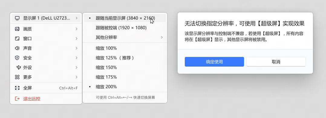 PC端用户,远程连接成功后,进入[控制中心],选择[跟随当前显示屏],若被控端设备分辨率无法匹配,则会触发超级屏。