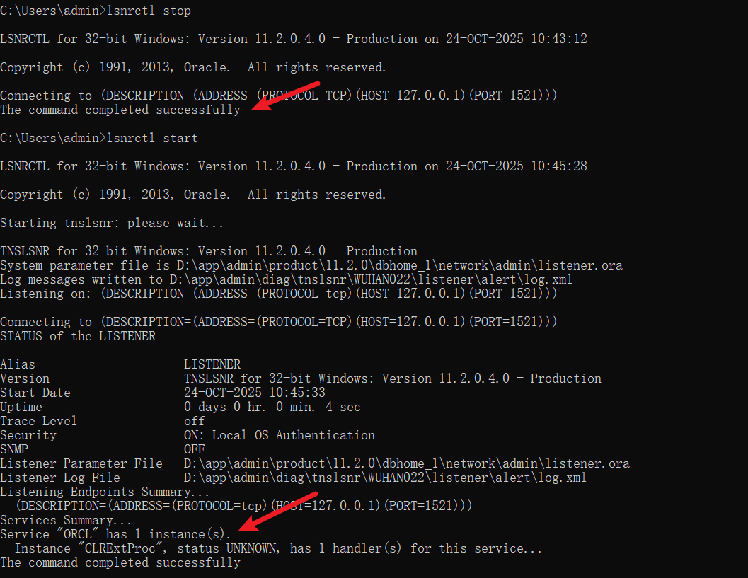 lsnrctl status # 查看监听状态(确认"服务摘要"中包含你的实例,如ORCL)