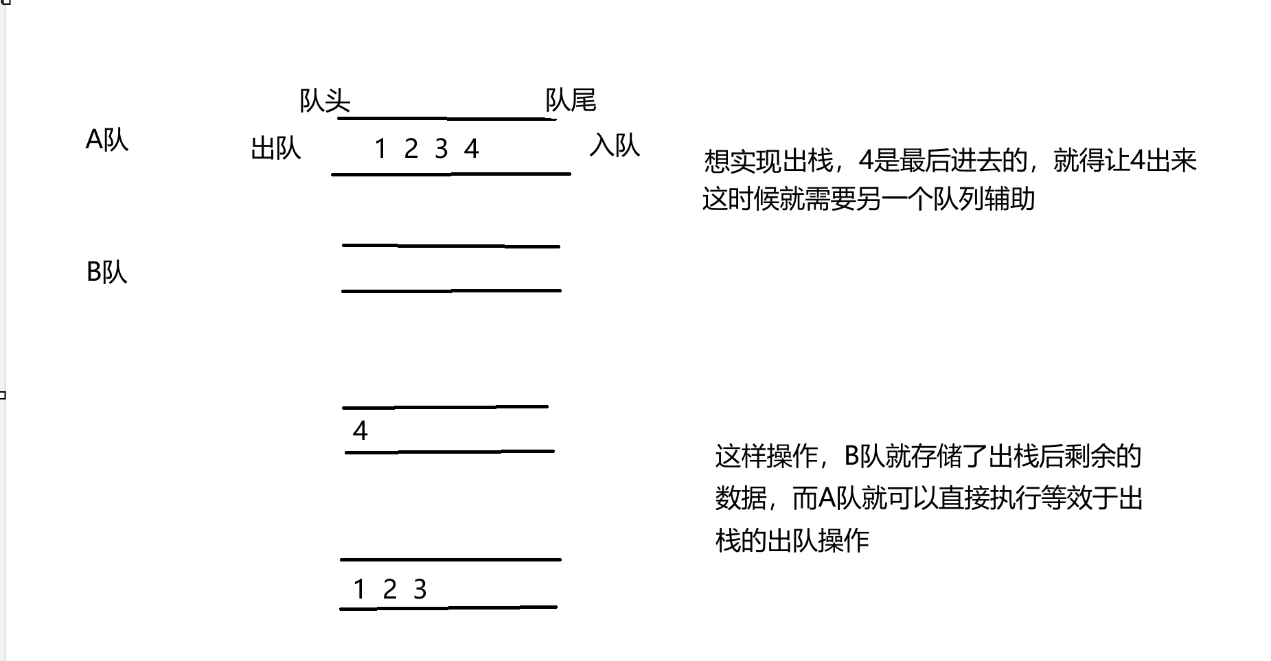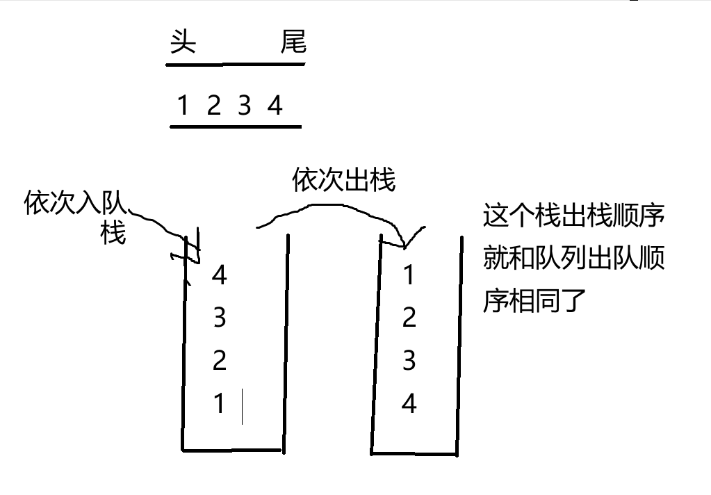 队列的入队与出队顺序相同,而栈的入栈出栈顺序相反,我们可以利用这个特点,用两次出栈使最终出栈的元素顺序与最开始入栈顺序相同,即实现了入队操作。我们称左边第一次入栈进入的是pushST,第二次入栈进入的是popST,因为最终这个栈弹出的元素是出队的元素顺序。