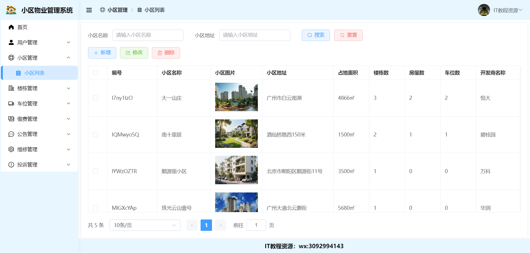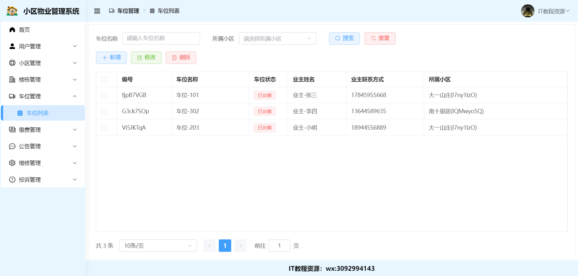 4.车位管理:新增、修改、删除、分页查询(所属小区)