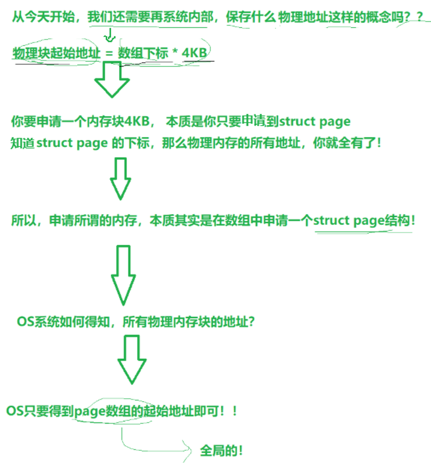 既然我们已经知晓了page结构体,在OS内定义一个全局的数组 struct page pages[1048576] --> 对整个物理内存的管理就转换成了对数组的增删查改.只要OS在加载开机的时候,这个全局数组的每个page就天然有下标了.
