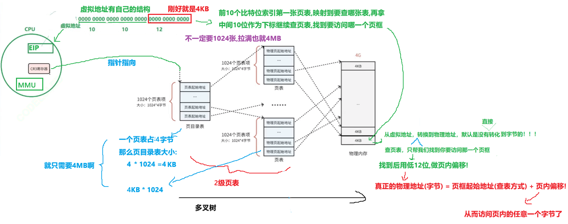 在32位机器下,CR3寄存器读取页目录起始地址,将虚拟地址中的前10个比特位进行索引找到页目录表的对应位置,而这个位置会指向对应的页表,既然知道了是哪一个页表,就需要知道是物理地址的哪一个页框,接着会用中间10位作为下标知道要访问哪一个页框.找到页框后,这个页框是4KB的啊!!!默认是没有直接转化到字节的!因此用低12位做页内偏移,从而做到虚拟地址到物理地址的映射!!!