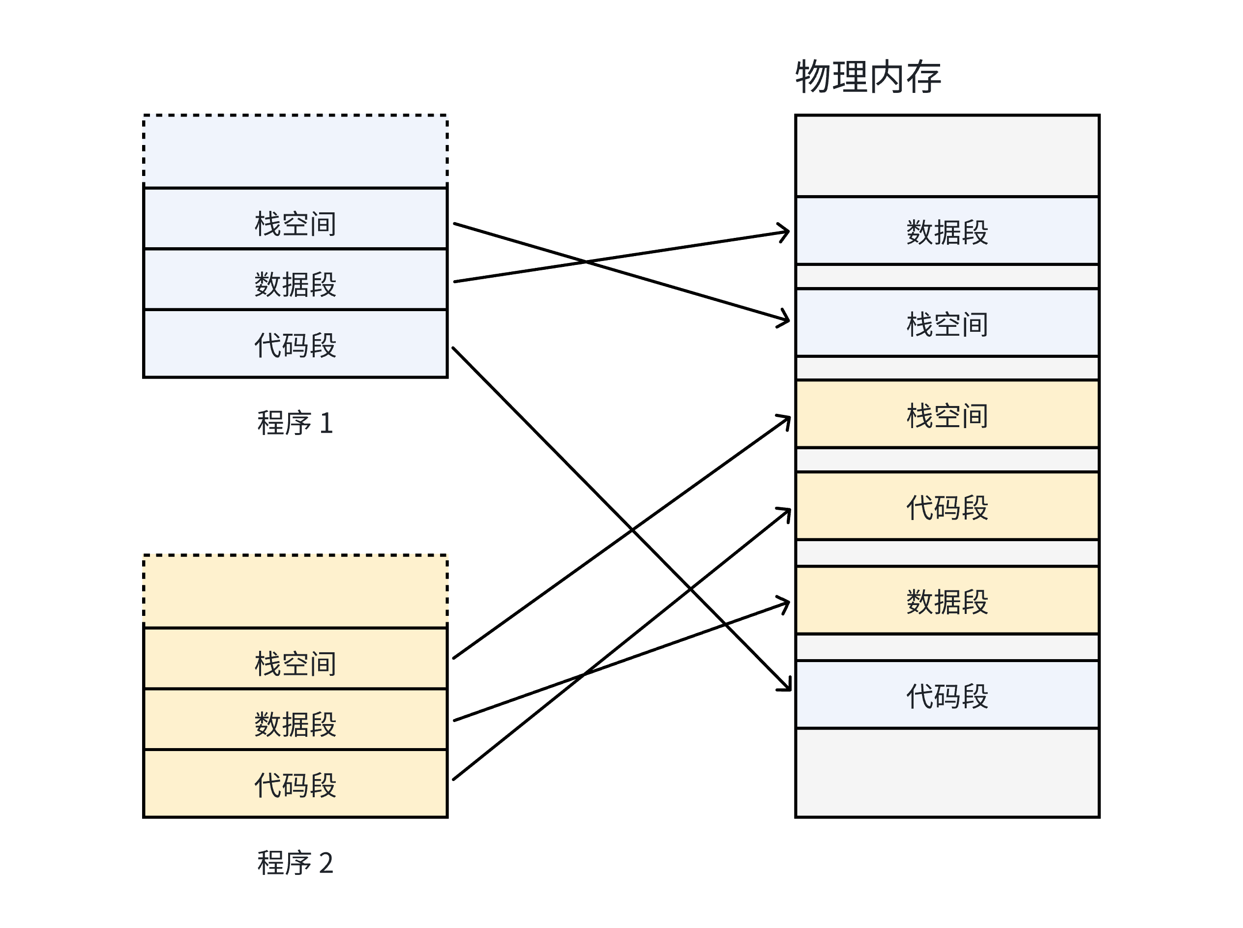 我们前面说过在没有虚拟内存和分页机制的情况下,每⼀个用户程序在物理内存上所对应的空间必须是连续的.