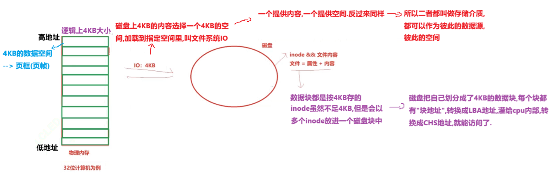 既然物理内存和磁盘划分都是以4KB为单位了,那么我们是否可以理解成将磁盘上4KB的内容选择一个4KB的空间,加载到指定空间里呢?这不就叫做文件系统IO吗!!! --> 进一步理解,一个提供内容,一个提供空间,反过来也是可以成立的 --> 所以我们把二者都叫做存储介质啊!都可以作为彼此的数据元,彼此的空间!
