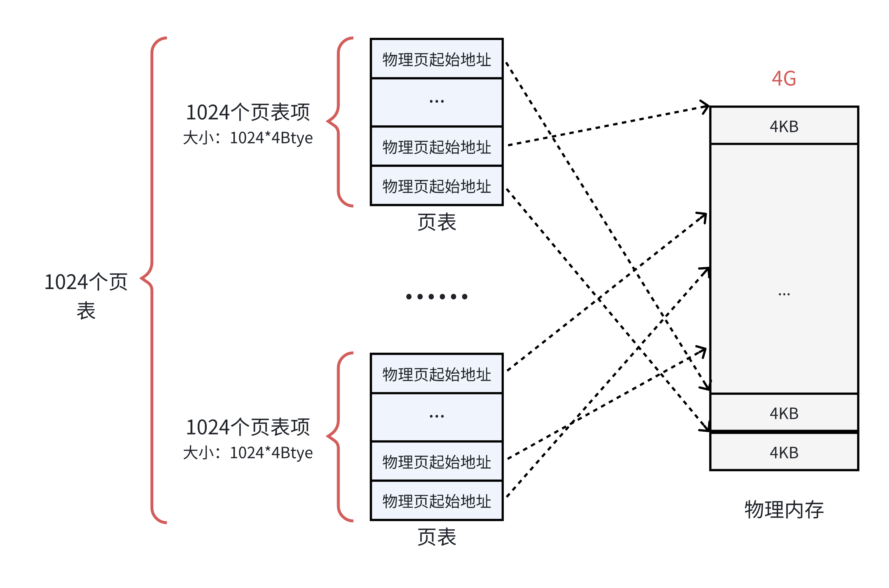 在 32 位系统中,地址的长度是 4 个字节,那么页表中的每⼀个表项就是占⽤ 4 个字节。所以⻚表占据的总空间大小就是: 1048576 * 4 = 4MB 的⼤⼩。也就是说页表自己本身,就要占用 4MB / 4KB = 1024 个物理页。虽然相比前面一个页表需要占用32GB大小,这个的牺牲算小了些,但还是存在一些问题: