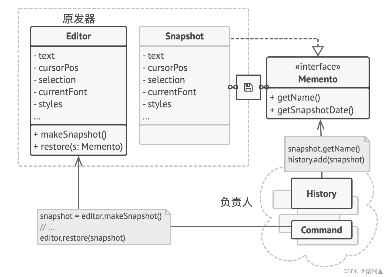 - 原发器(Originator)类可以生成自身状态的快照,也可以在需要时通过快照恢复自身状态。