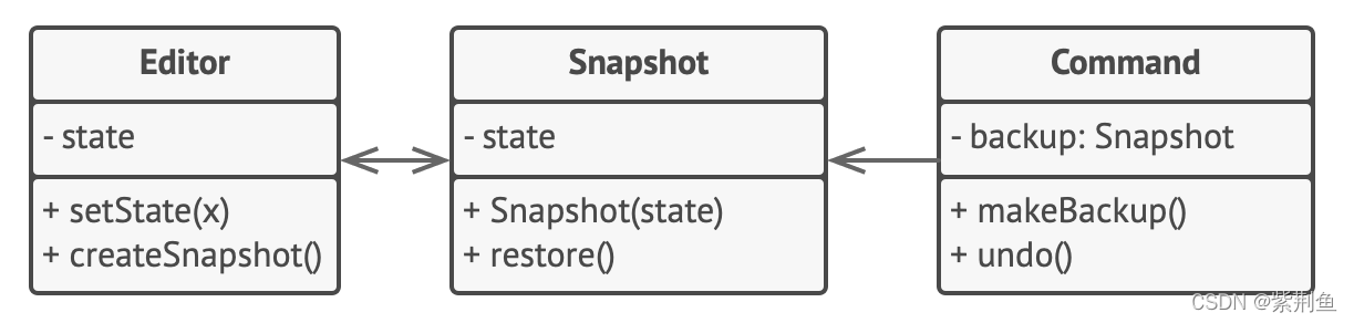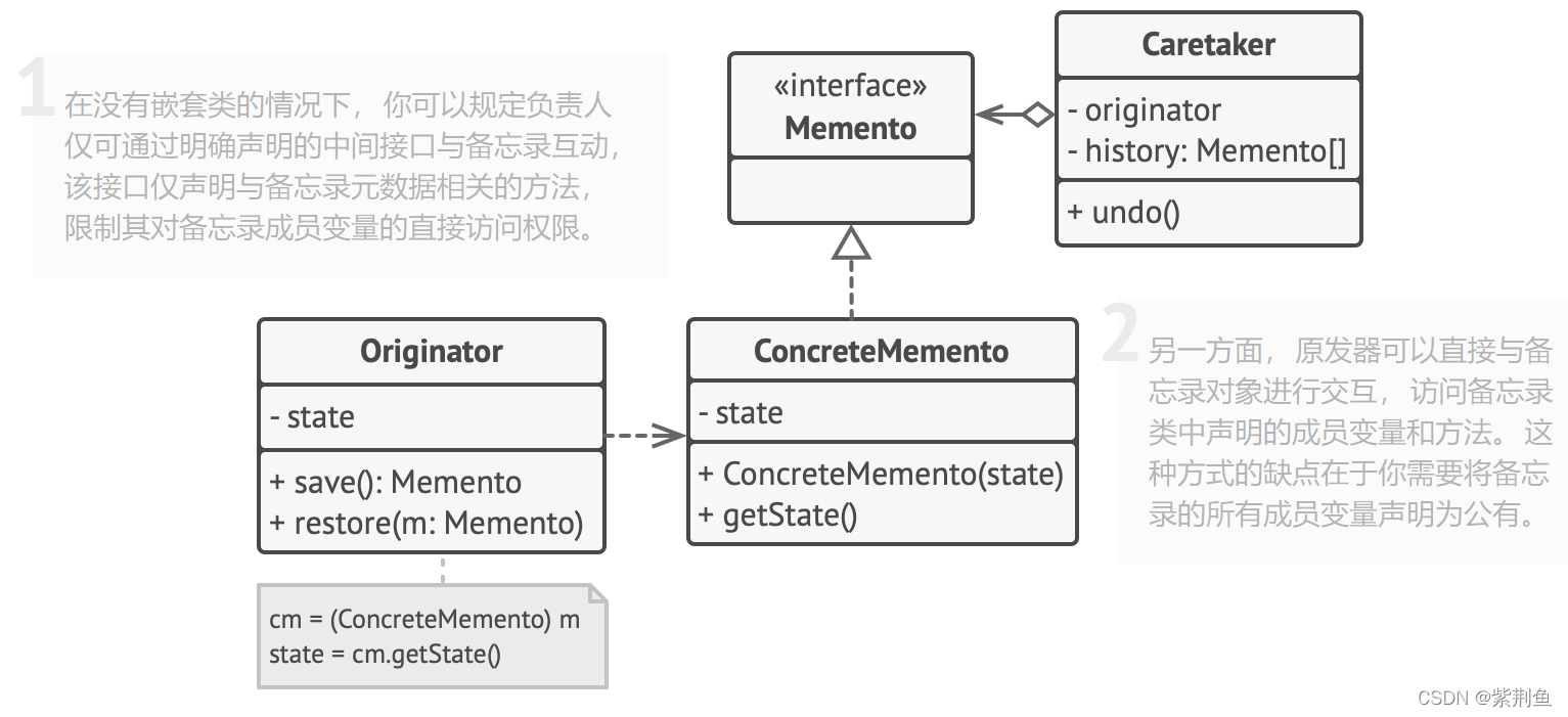 - 另一方面,原发器可以直接与备忘录对象进行交互,访问备忘录类中声明的成员变量和方法。这种方式的缺点在于你需要将备忘录的所有成员变量声明为公有。