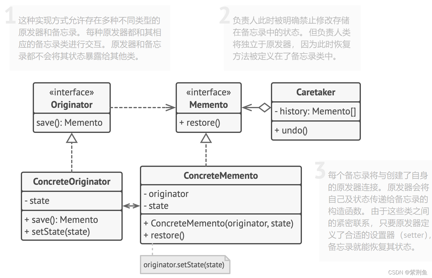- 这种实现方式允许存在多种不同类型的原发器和备忘录。每种原发器都和其相应的备忘录类进行交互。原发器和备忘录都不会将其状态暴露给其他类。