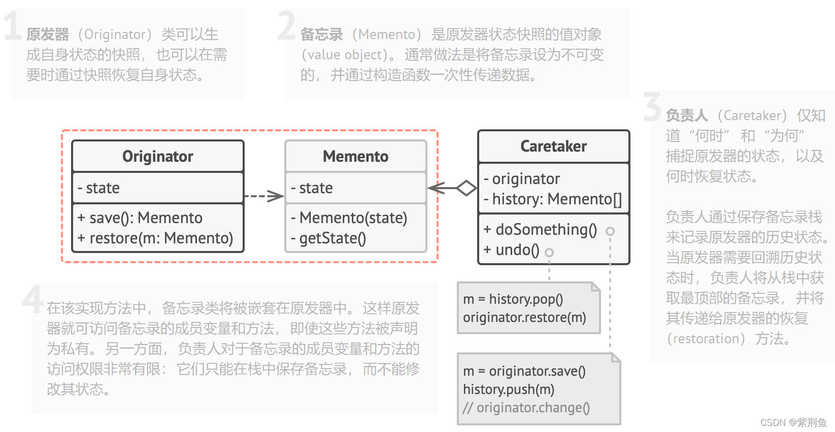 - 负责人(Caretaker)仅知道"何时"和"为何"捕捉原发器的状态,以及何时恢复状态。负责人通过保存备忘录栈来记录原发器的历史状态。当原发器需要回溯历史状态时,负责人将从栈中获取最顶部的备忘录,并将其传递给原发器的恢复(restoration)方法。