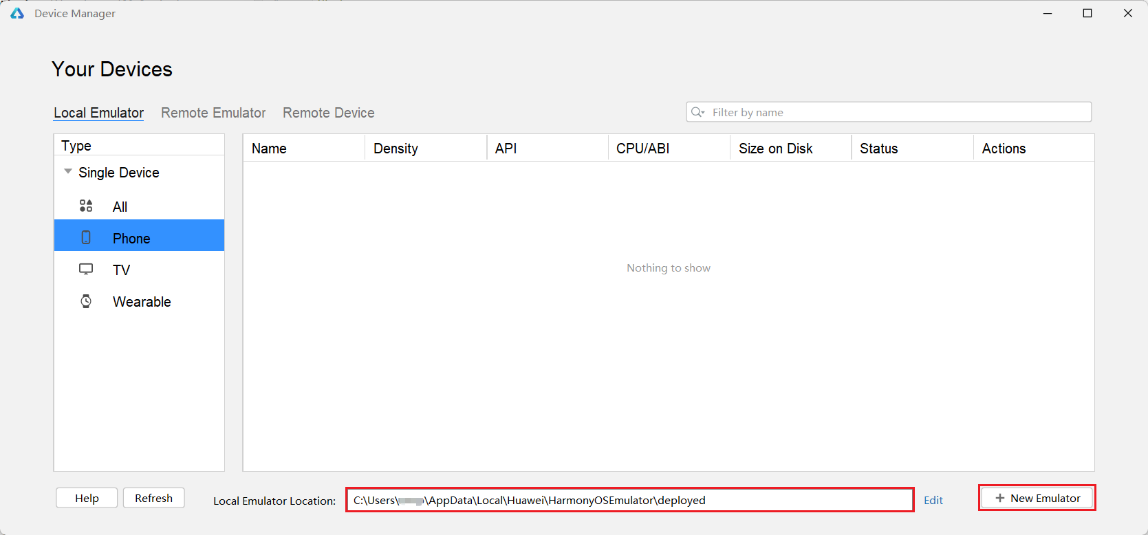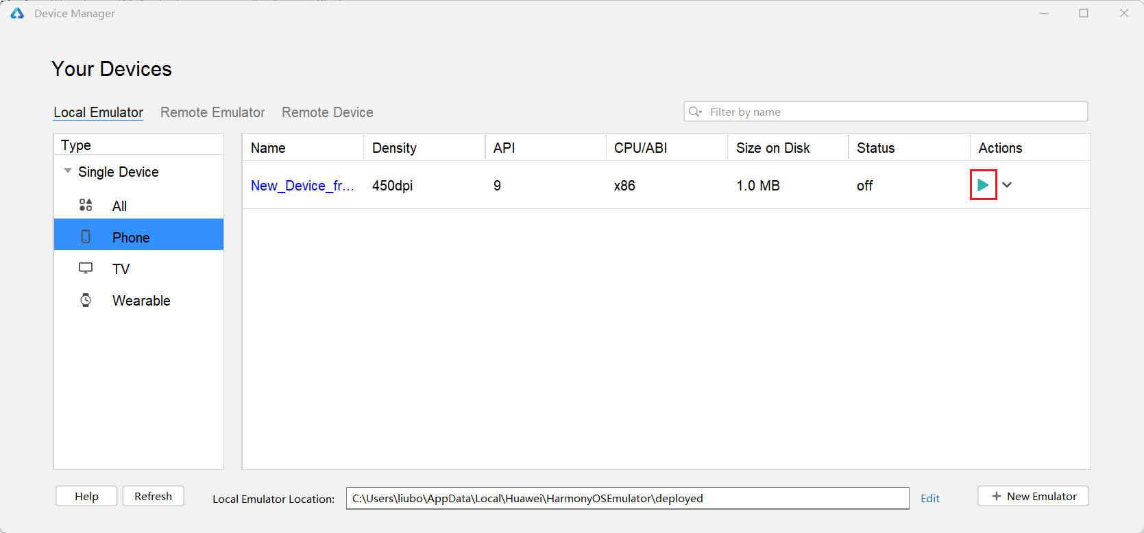 4选择模拟的安装目录,完成后点击New Emulator。