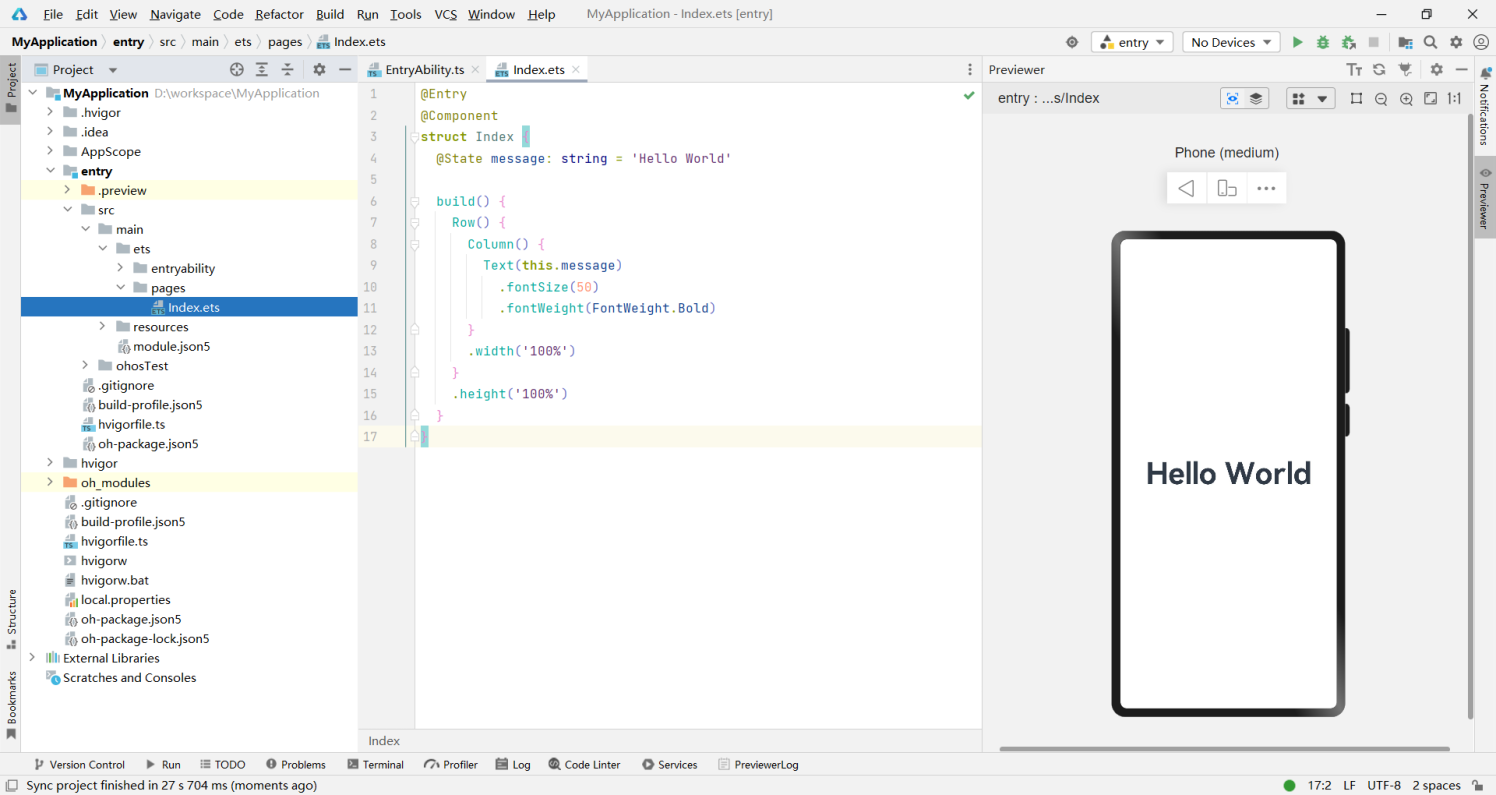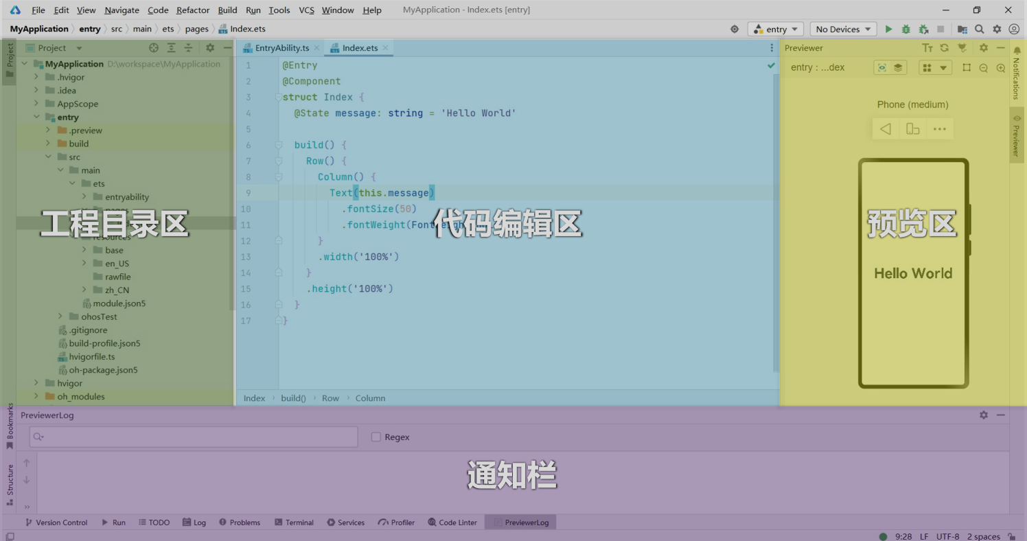 Previewer预览用于查看应用的UI界面效果,方便随时调整界面UI布局。只需打开需要预览的页面文件,例如下图中的Index.ets,然后点击IDE右侧的Perviewer即可看到预览效果。