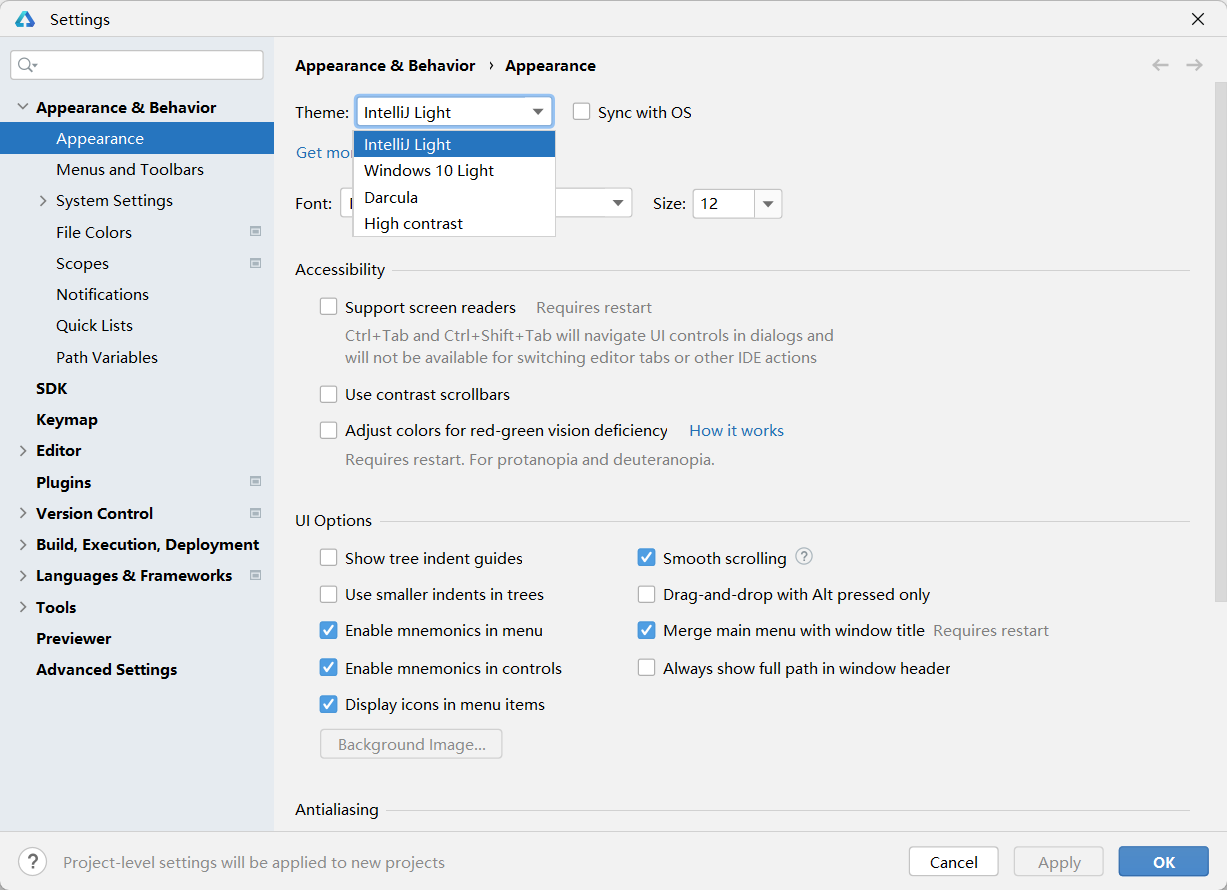 10在Appearance & Behavior/Appearance的Theme中可选择主题