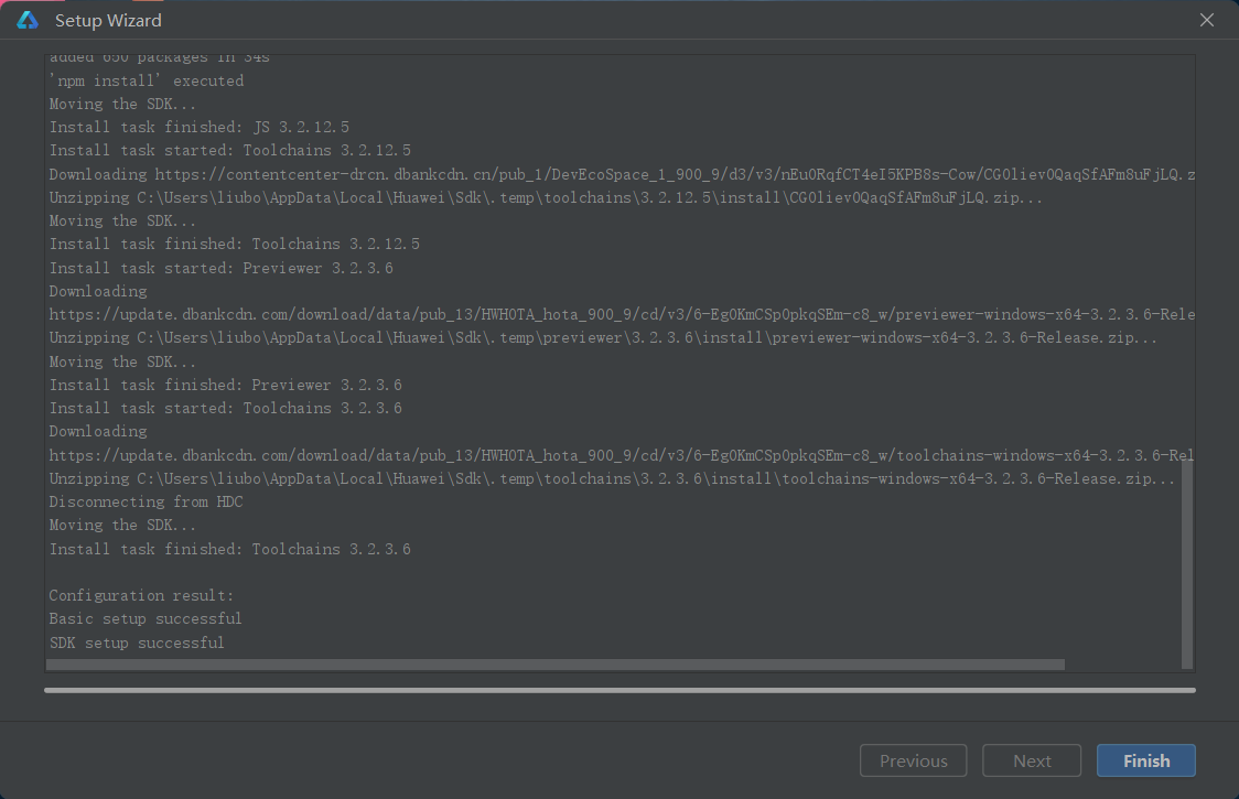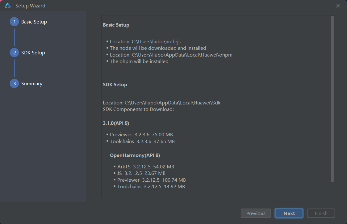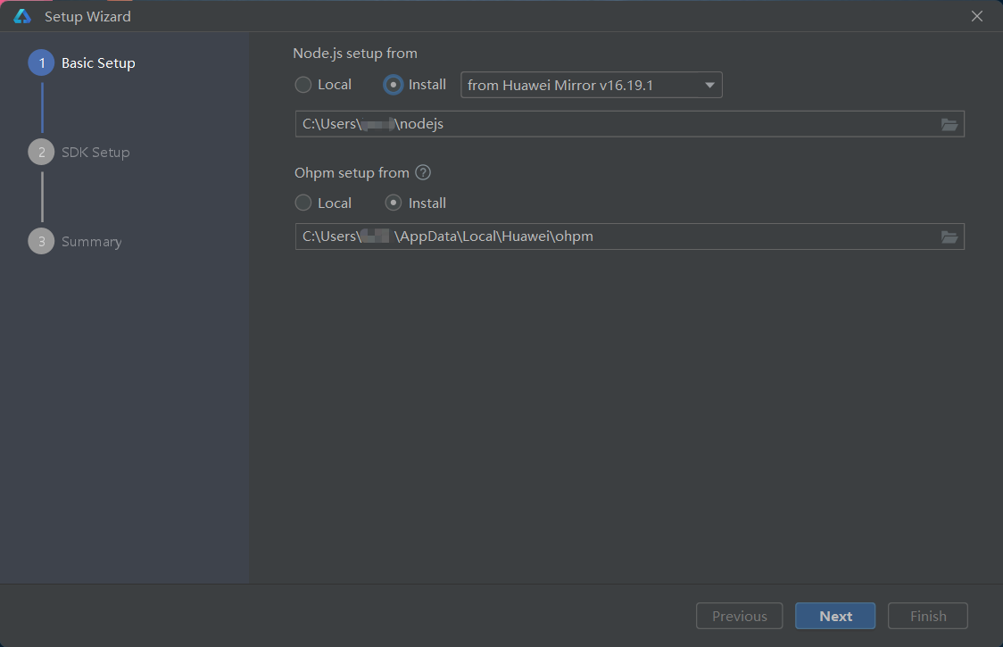 3初次启动会出现如下设置向导,首先需要为nodejs和ohpm选择合适的安装路径,完成后点击Next即可