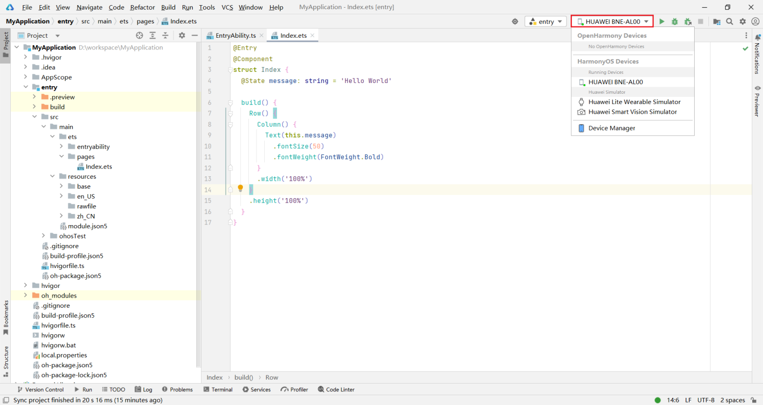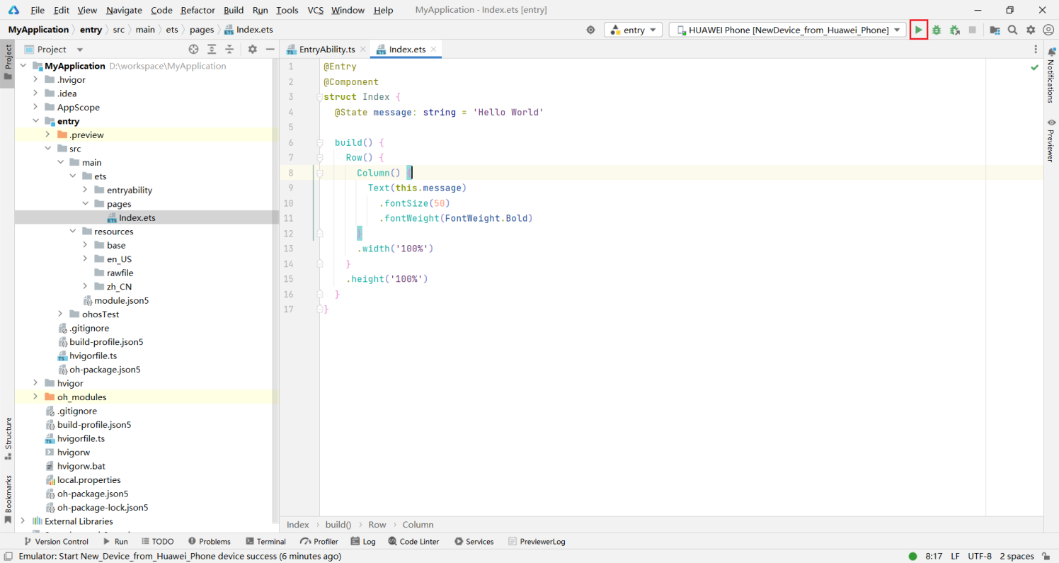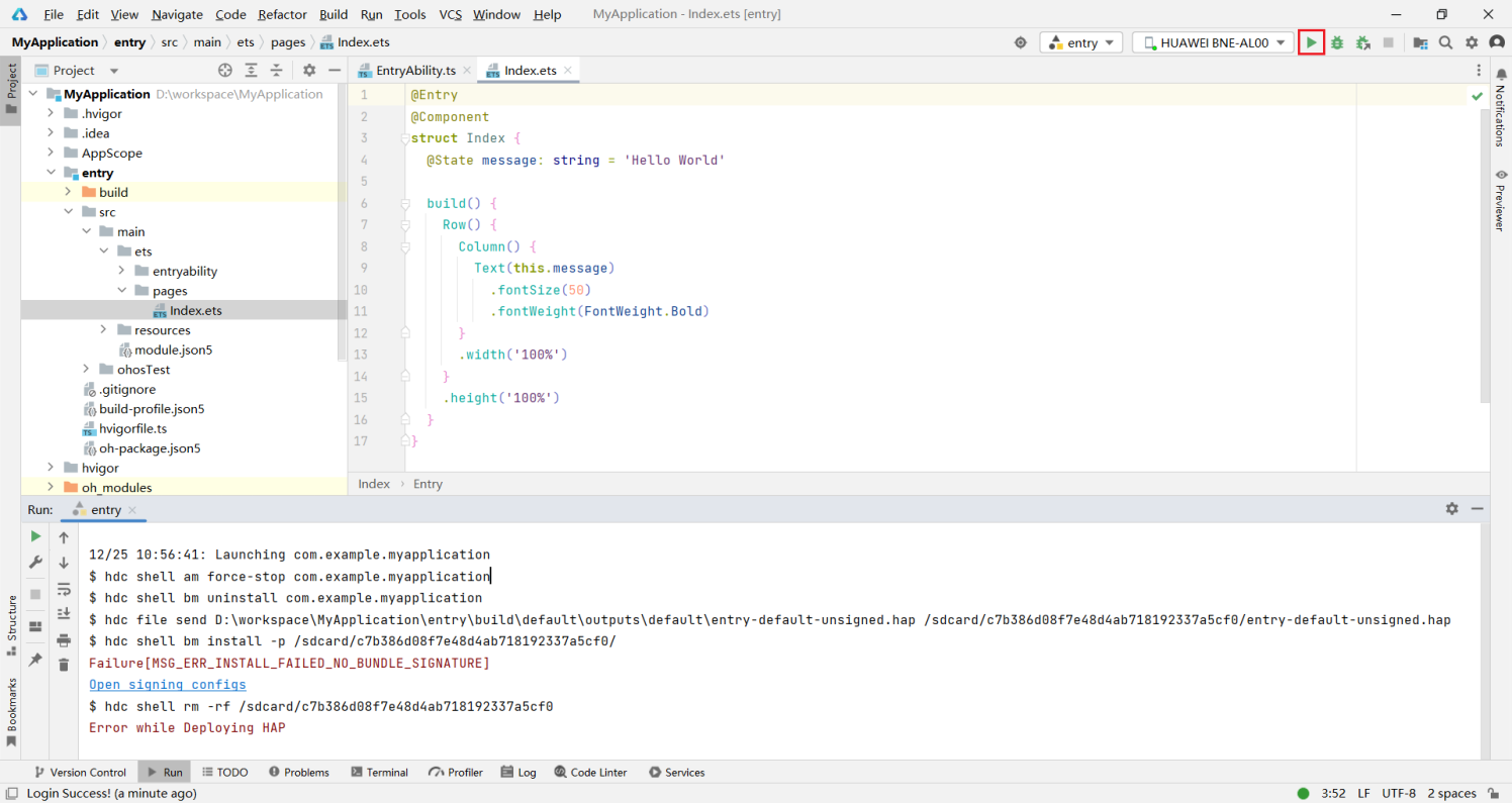 10登录成功后,回到IDE,再次点击运行按钮,即可将应用运行到真机。