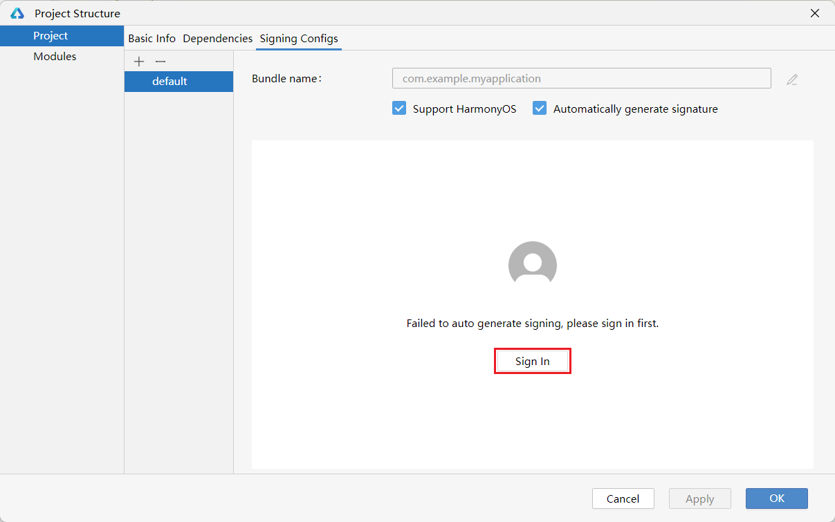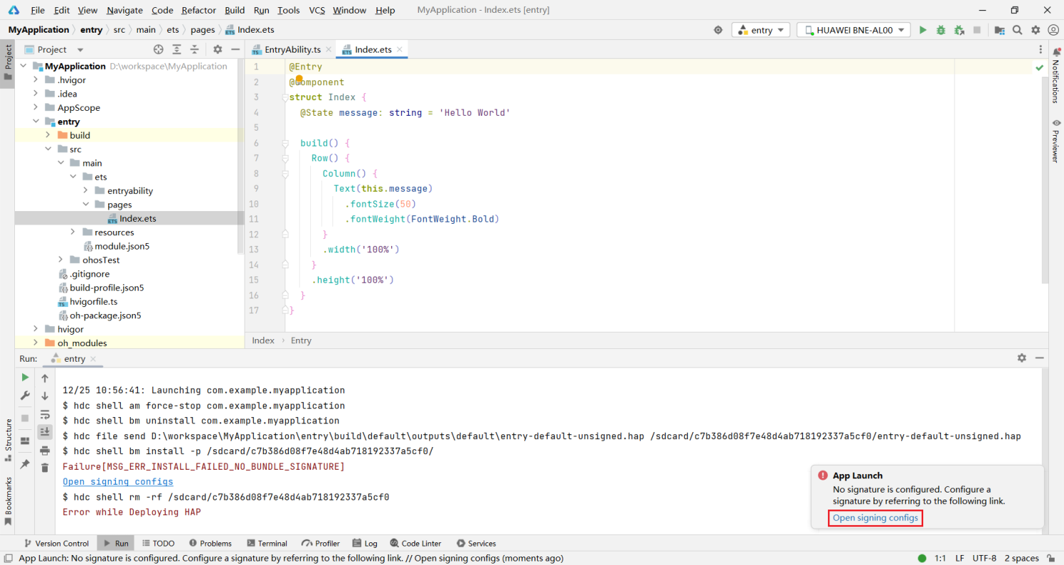 7最后点击运行按钮,即可将项目运行到真机中。首次运行会提示缺少签名信息,点击Open signing configs进行配置即可。