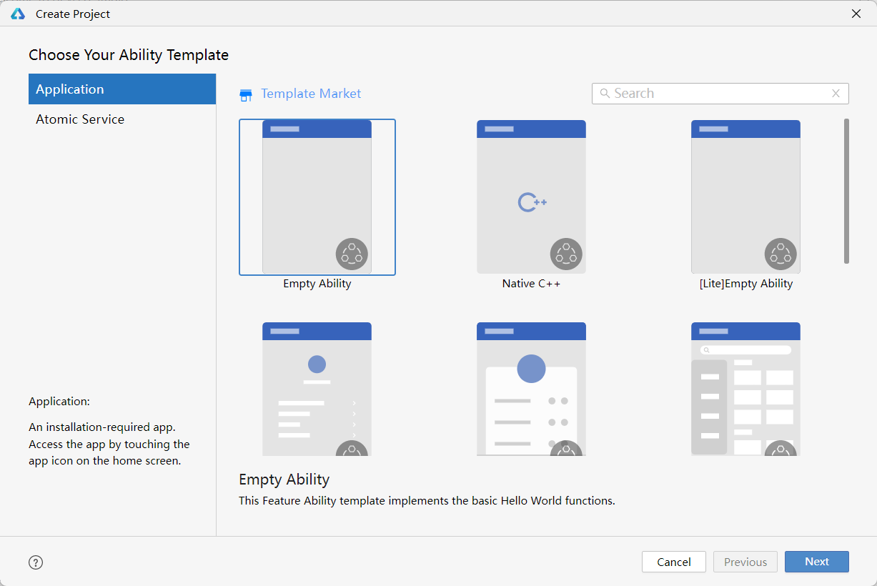 2选择项目模版,此处选择第一个Empty Ability即可。