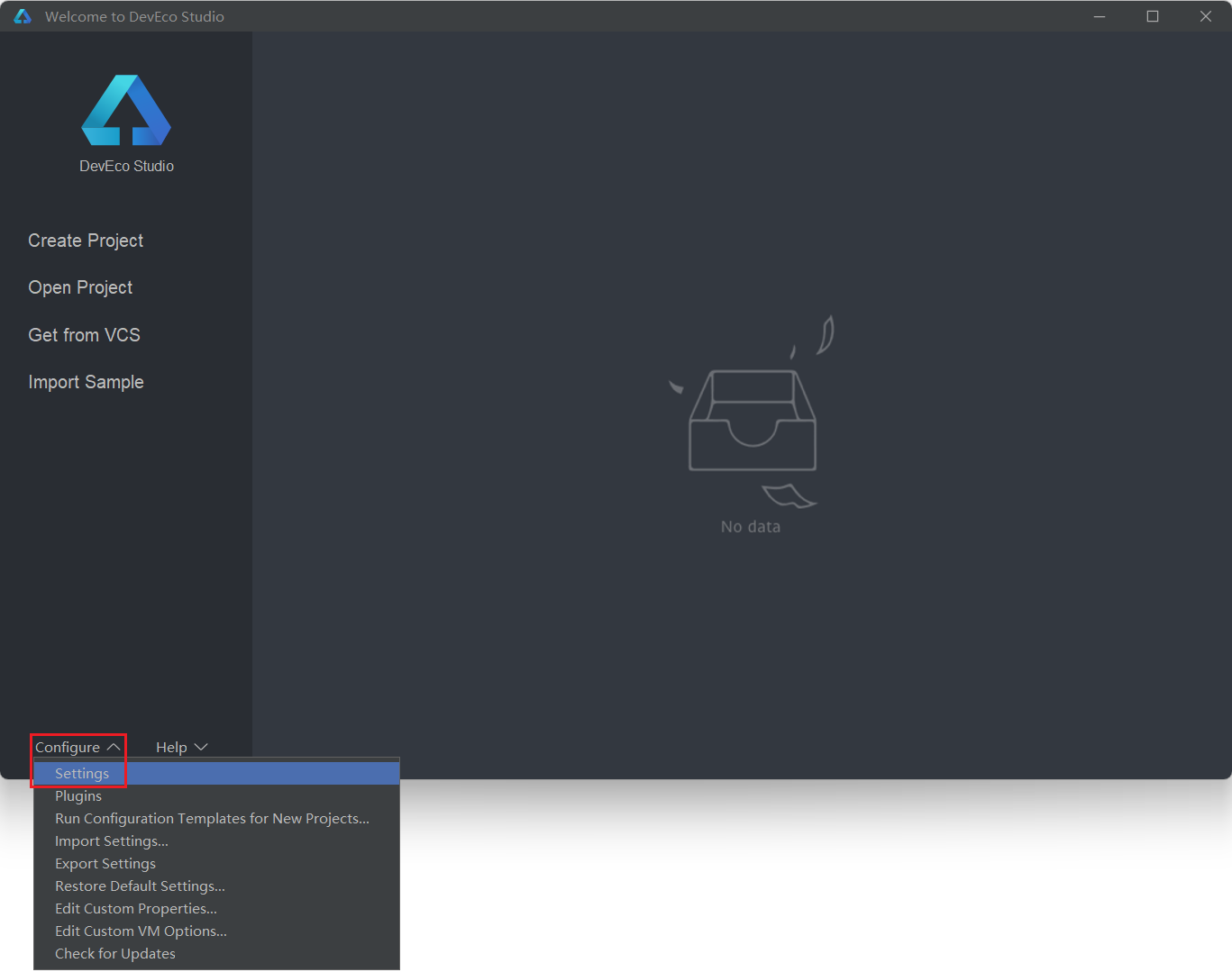 9完成配置后,可根据喜好调整DevEco Studio主题风格,点击Configure下的Settings。
