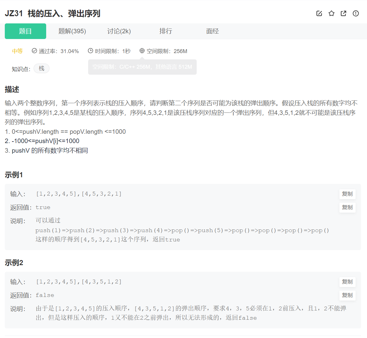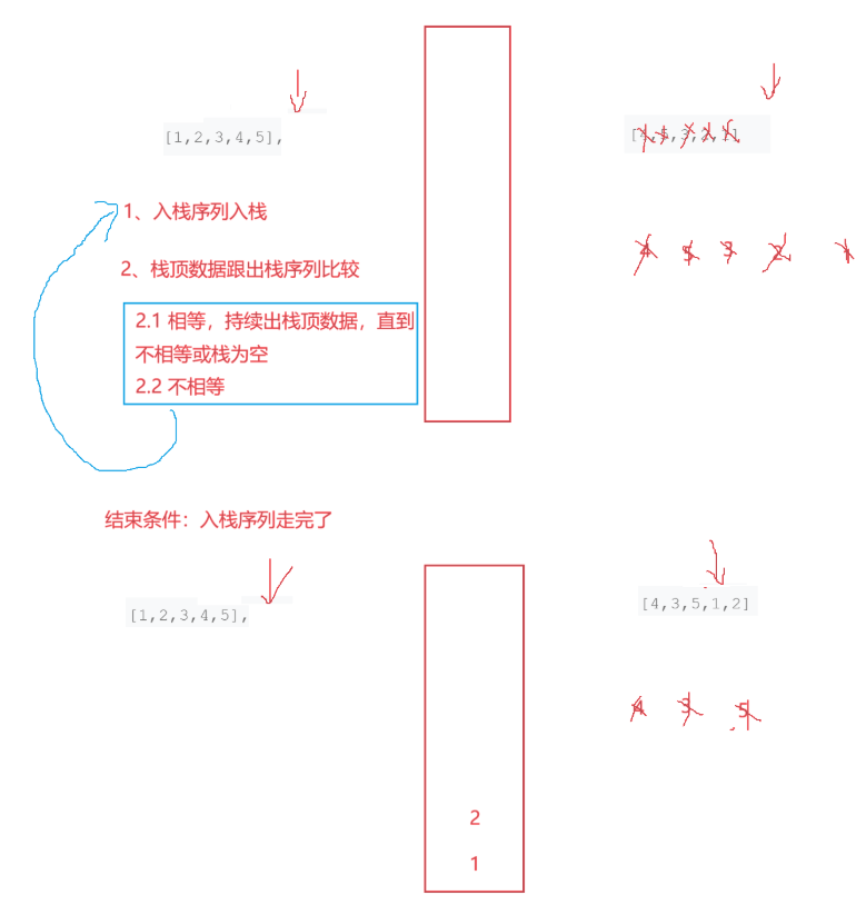 我们有两个整数序列,我们把入的栈命名为 _st,一定是栈顶·元素·和出栈序列去比较,而不是遍历入栈序列和出栈序列比较。如果入栈序列走完了,栈内还有元素,就代表出栈序列是不合法的的。