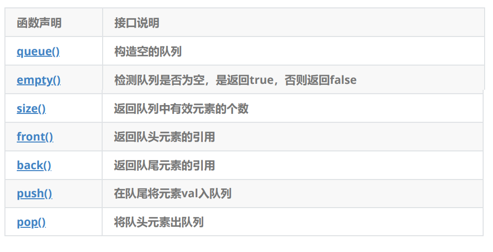 底层容器可以是标准容器类模板之一,也可以是其他专门设计的容器类。该底层容器应至少 支持以下操作: empty:检测队列是否为空 size:返回队列中有效元素的个数 front:返回队头元素的引用 back:返回队尾元素的引用 push_back:在队列尾部入队列 pop_front:在队列头部出队列