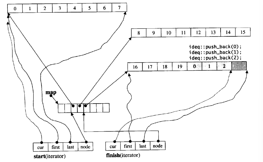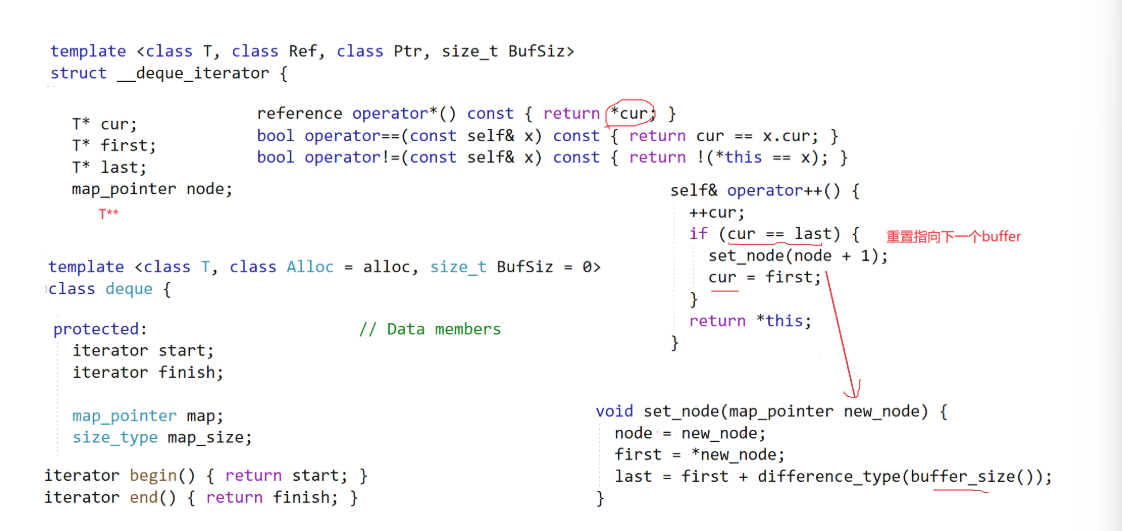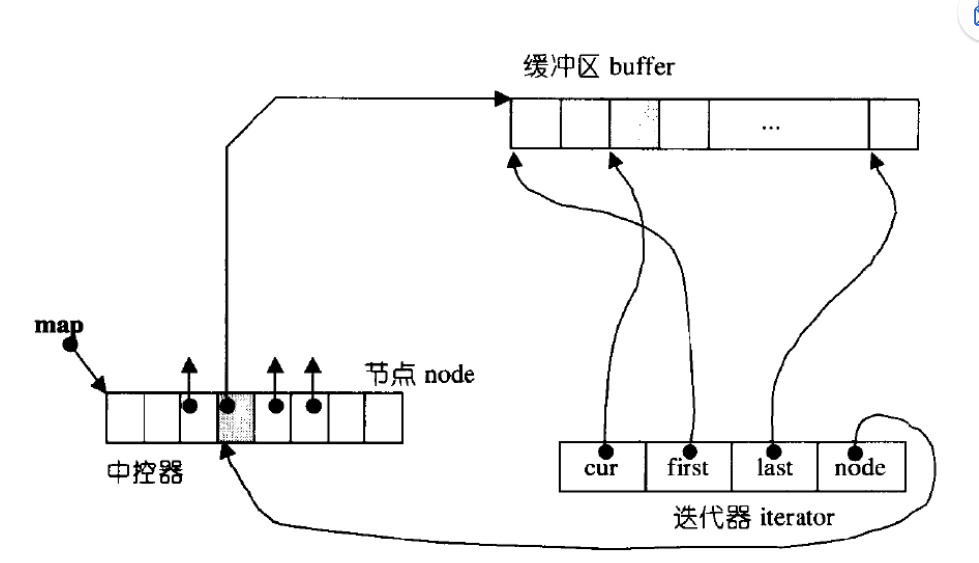 双端队列底层是一段假象的连续空间,实际是分段连续的,为了维护其"整体连续"以及随机访问 的假象,落在了deque的迭代器身上,因此deque的迭代器设计就比较复杂,如下图所示: