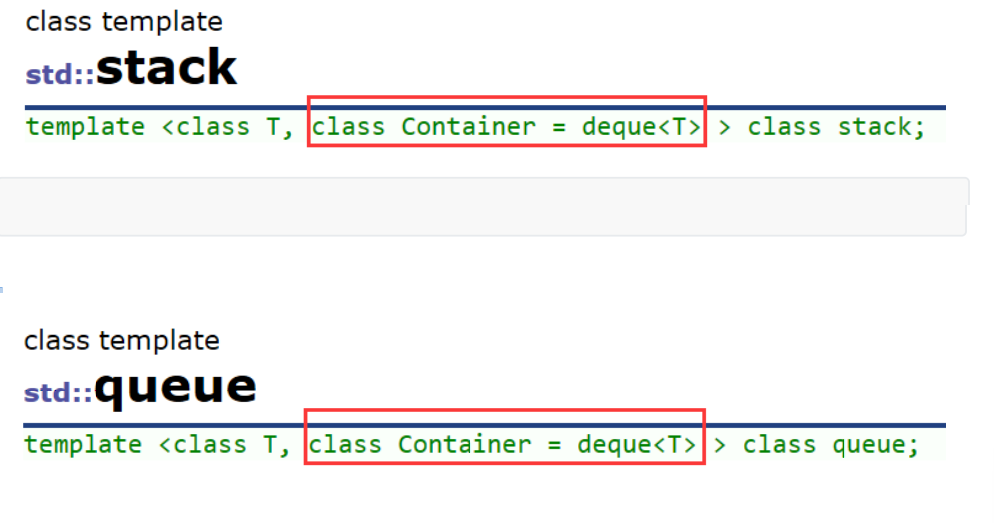 2 STL标准库中stack和queue的底层结构 虽然stack和queue中也可以存放元素,但在STL中并没有将其划分在容器的行列,而是将其称为 容器适配器,这是因为stack和队列只是对其他容器的接口进行了包装,STL中stack和queue默认 使用deque,比如:
