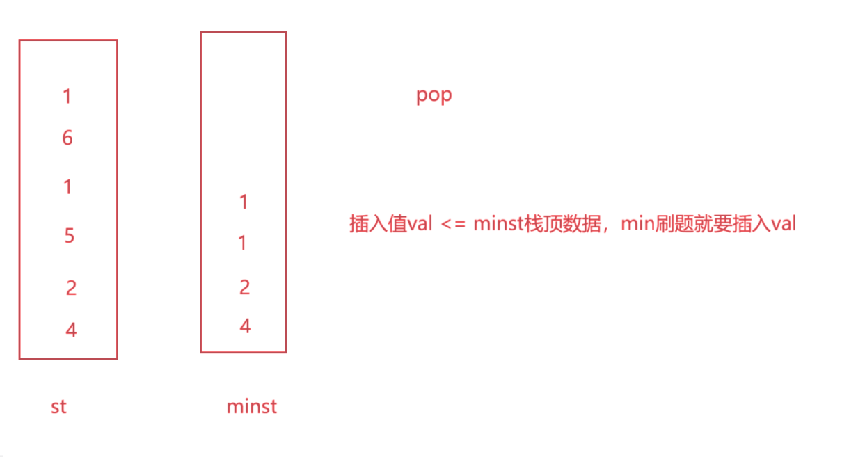 我们可以使用两个栈,第一个个栈st正常存储元素,第二个栈minst用来存储较小元素:在st存入数据时,minst和自己栈顶元素比较,如果比栈顶元素小,则入栈,反之,则不入栈。(注意,相等的时候也要入栈,否则会出错),最后在minst栈顶的就是最小元素。