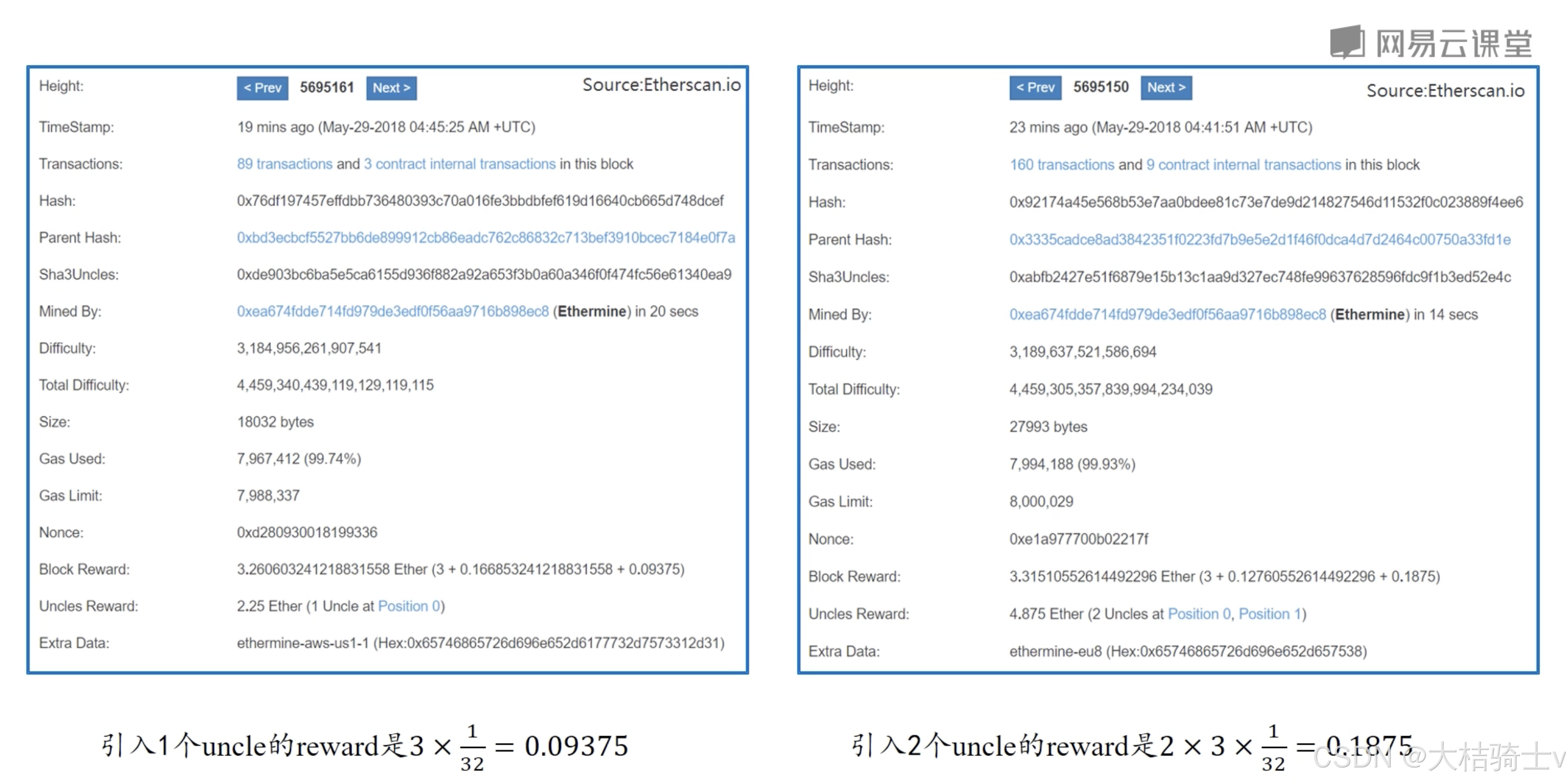 右边的block引入了一个距离为2的区块和一个距离为1的区块,所以那两个区块的uncle reward加起来是2.25+2.625,而该区块自己引入叔父区块带来的奖励也是翻倍的。