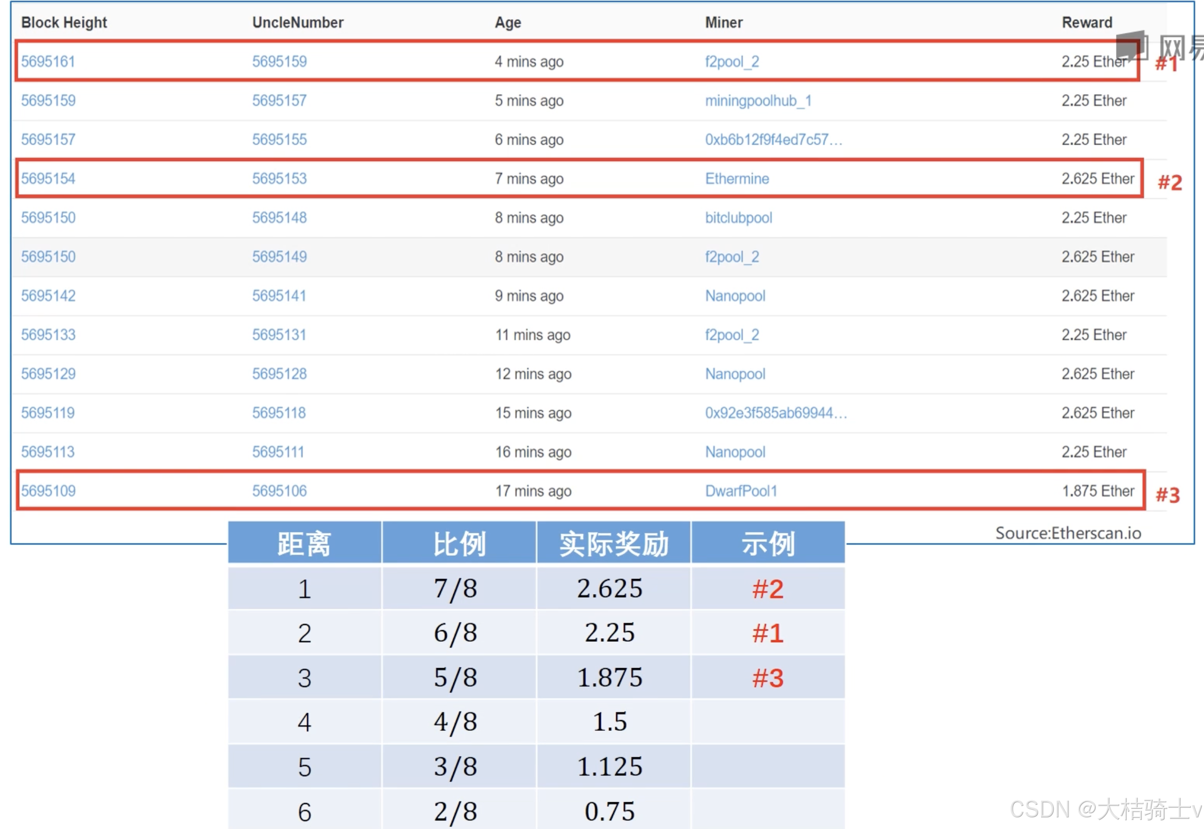 BlockHeight就是区块的序号,而UncleNumber就是和叔父区块对应的最长合法链上对应区块的那个序号。所以UncleNumber减去BlockHeight就是两者相差的代际,当代叔父是#2的例子(距离为1),再上一代就是#1的例子(距离为2)。