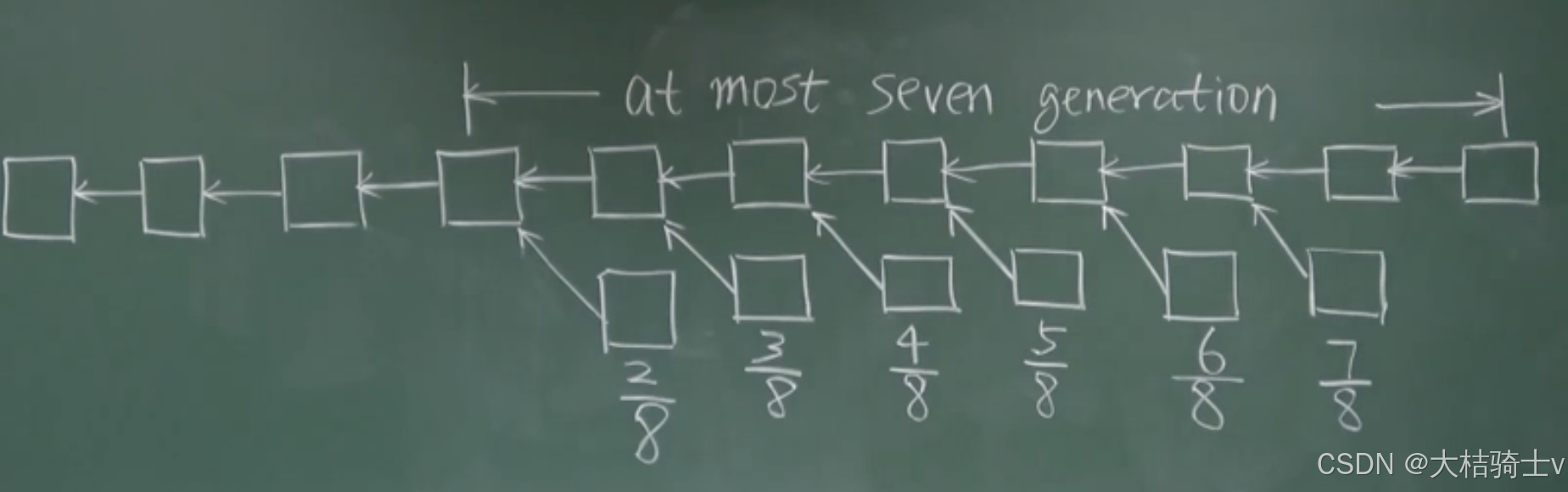 所以以太坊要求叔父区块的定义,必须和当前区块在七代以内有共同的祖先 (也即合法的叔父只有六个备份),并且会随着叔父的代际递减给叔父区块被包含的出块奖励,最多78\frac{7}{8}87,最少28\frac{2}{8}82: