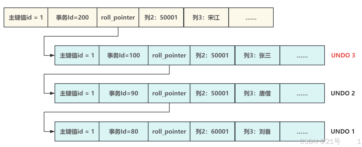 Undo Log组织成⼀个Undo链,在数据⾏的头部通过数据⾏中的 roll_pointer 与Undo Log中