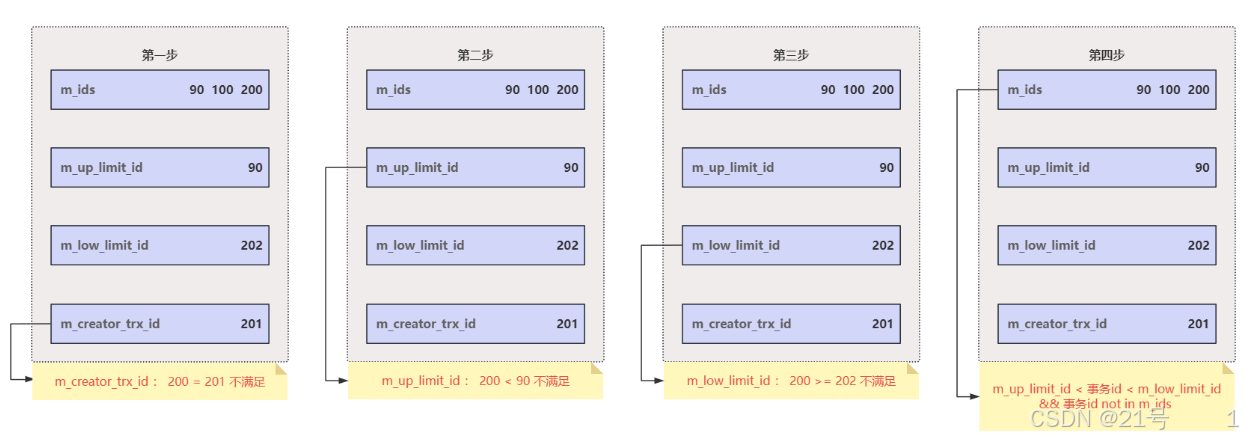 - 若 min_trx_id ≤ DB_TRX_ID ≤ max_trx_id:看 DB_TRX_ID 是否在 m_ids 中 ------ 在则事务未提交,不可读;不在则已提交,可读。
