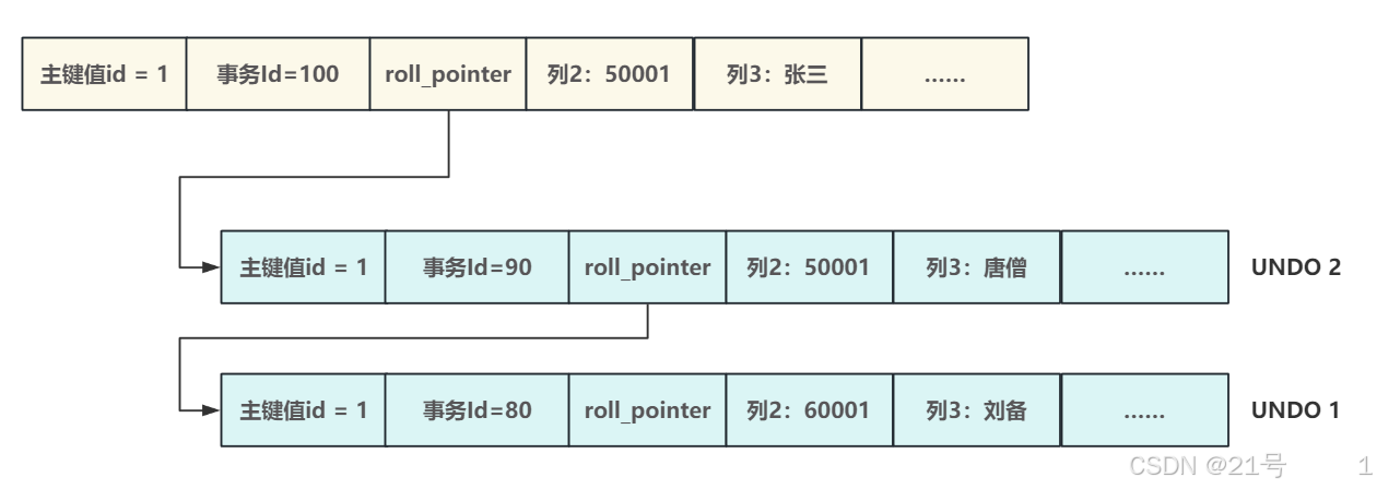 记录⼀个叫做 roll_pointer 的引⽤信息,通过 roll_pointer 就可以将某条数据对应的