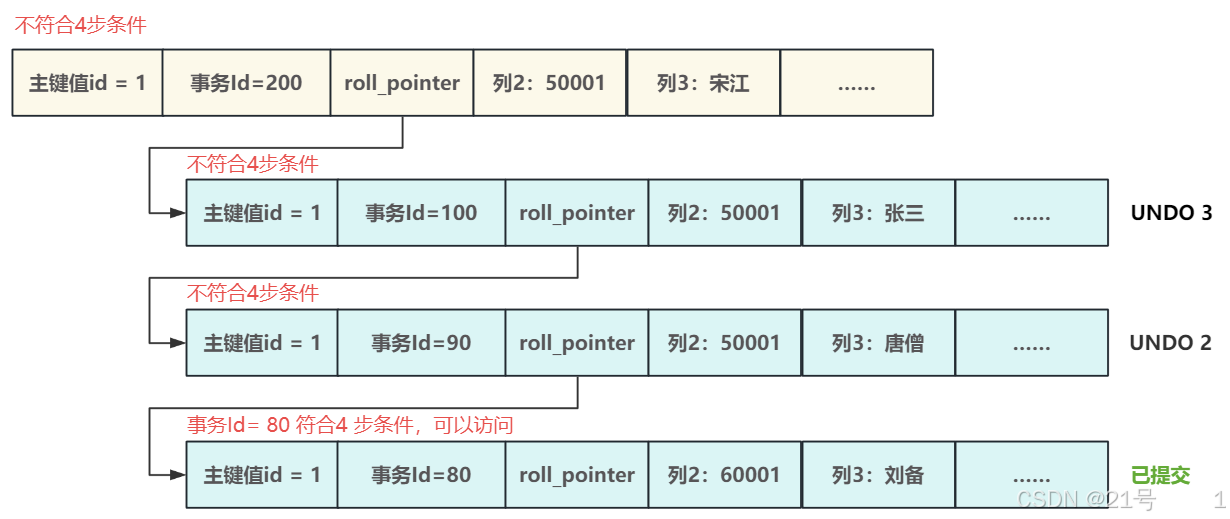 • 这样从版本链头遍历判断到版本链尾,找到⾸个符合要求的版本即可,就可以实现查询到的结果都是已经提交事务的数据,解决了脏读问题。