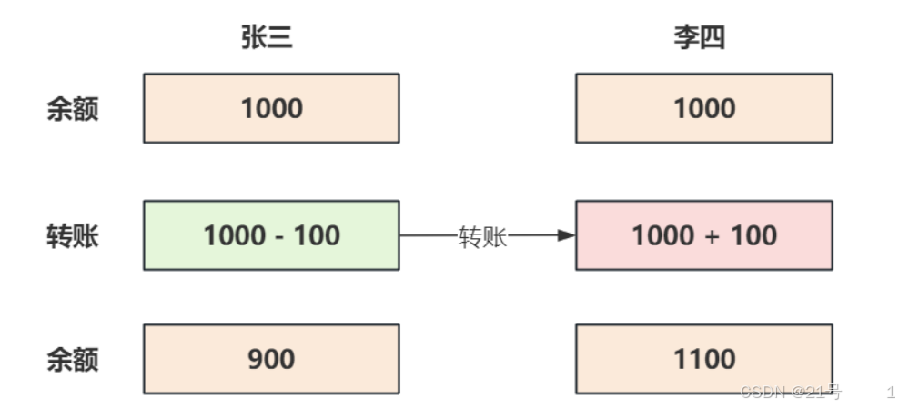 - 张三的账⼾余额减少 100 ,变成 900 ,李四的账⼾余额增加了 100 ,变成 1100 ,不能出现张