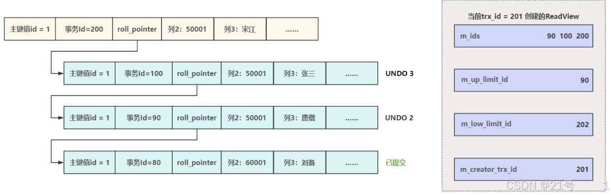 - m_ids:当前 "活跃的事务 ID 列表"(即还没提交的事务)。