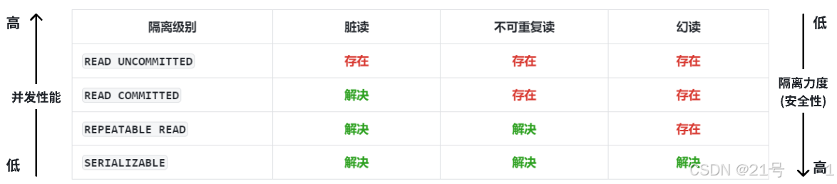 - 优点是在保证高一致性的同时,并发性能优于最高级别 "串行化",是多数业务的首选。