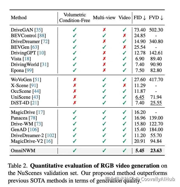 - 视频生成质量: 在FVD、LPIPS等指标上全面领先,无需Occupancy或点云条件仍超越所有SOTA。