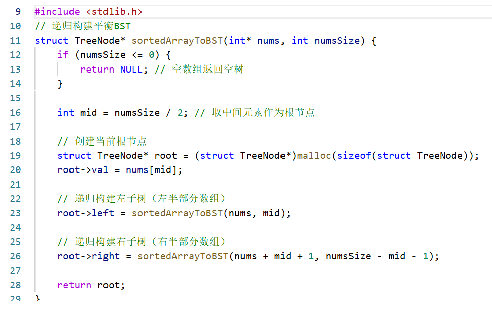 该方法的核心是中间元素为根,递归分割数组,既利用了升序数组的有序性满足 BST 的数值关系,又通过均衡分割保证了树的平衡性,是一种高效、简洁的构建方式。