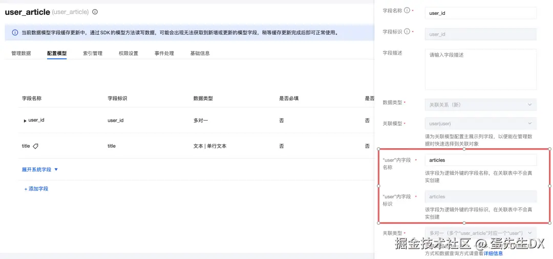 蛋先生 :举个例子,user_article 模型里有个字段 user_id 要关联 user 模型,在配置关联时,需要声明在 user 模型中的字段,一开始我还真不适应