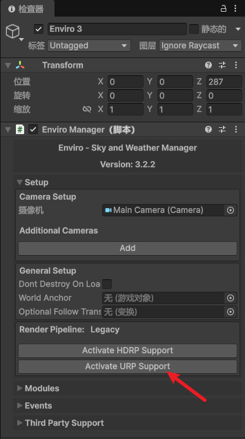 - [2、在 `Enviro Manager` -> `Setup` 部分点击 `Activate URP Support` 按钮。项目将重新编译,请稍等片刻。当显示 `Render Pipeline: URP` 时表示完成。](#2、在