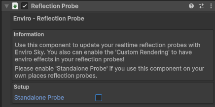 此反射探针脚本可以根据 Enviro 的时间进程渲染您的反射探针。在内置渲染管线中,它还允许您将体积云渲染到反射探针中。