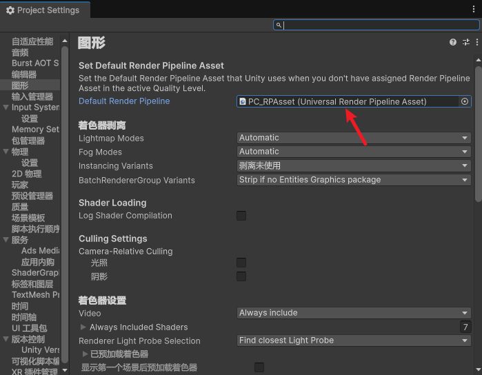 3、打开 Project Settings -> Graphics,双击您的渲染管线资产。