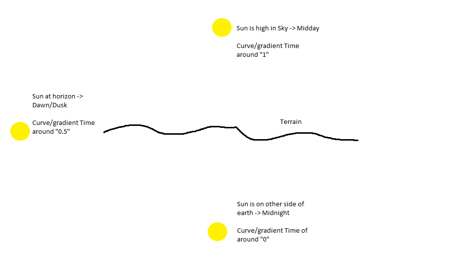Enviro 大量使用了渐变和曲线。这些是基于 solarTime 和 lunarTime(范围从 0 到 1)进行计算的,它们描述了太阳/月亮在天空中的位置。
