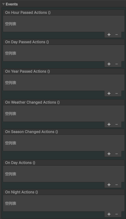 Add按钮将其他天气类型添加到此区域。同时不要忘记设置Probabillity!如果启用了Auto Change Weather,则每过Weather Intervall游戏时间小时,系统将尝试根据天气类型的Probabillity设置来更改天气。 - 您也可以点击