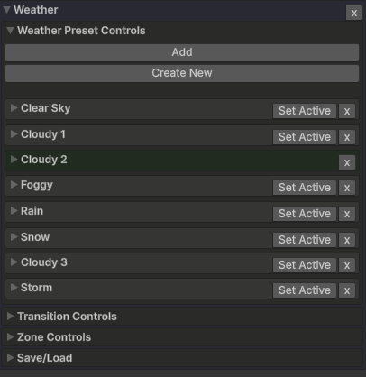 Set Active切换到该天气类型。 - 您也可以在此检查器中更改和调整每种天气类型的设置。