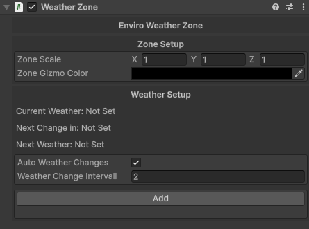 您可以通过 (Components -> Enviro 3 -> Weather Zone) 菜单将其添加到游戏对象。