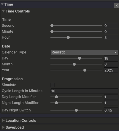 此模块控制日期、时间和地理位置。如果移除此模块,将显示一个简单的 NonTime 模块,您可以在其中设置太阳和月亮的位置。其他模块需要这些信息才能正常工作。