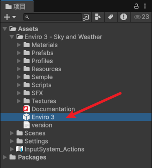 1、请查看项目中的 Enviro 3 -- Sky and Weather 文件夹,将 Enviro 3 预制体拖放到您的场景中。