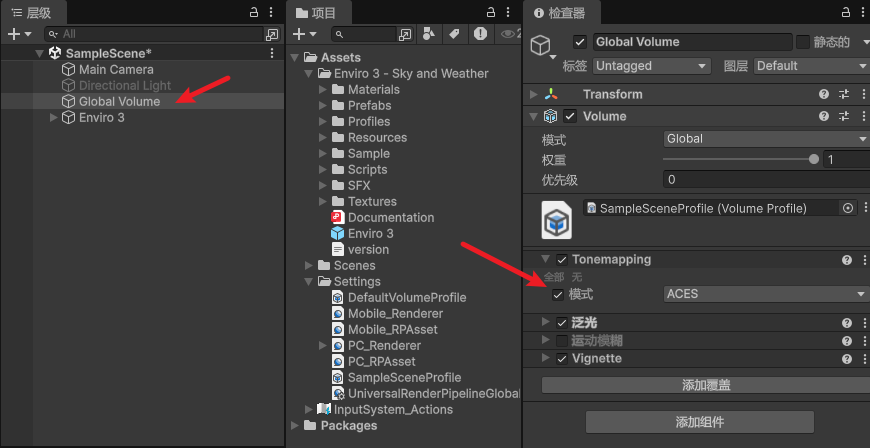 Global Volume。然后创建一个新的配置文件并添加Tonemapping模块。选择ACES模式以获得最佳效果。
